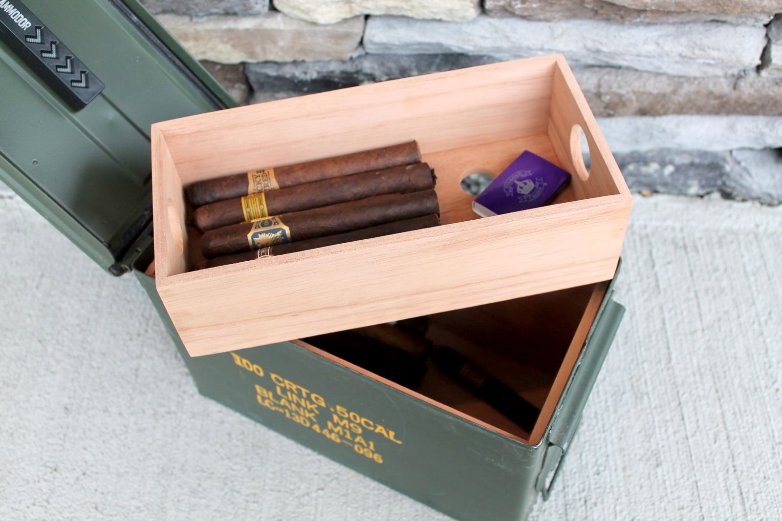 The 50 with Tray Ammodor ammo can cigar humidor is our best selling ammo box humidor PLUS an additional top tray that is handmade using 1/4″ solid wood Spanish Cedar! It’s patent pending and built using a .50 cal/5.56 size M2A1 ammunition can – just like the original Ammodor back in 1998. This version includes a removable top tray!
