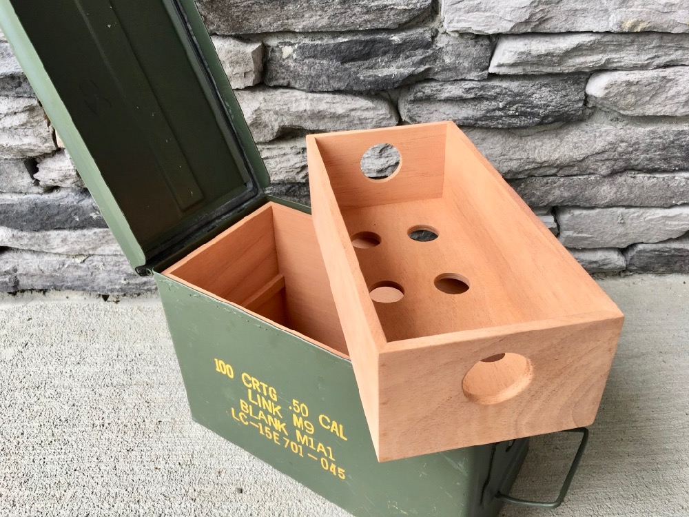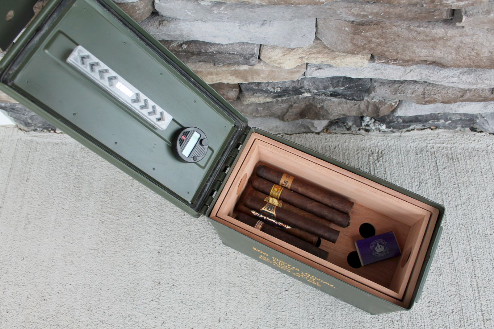 Ammodors ammo can humidors are built using surplus ammo cans that have been proudly used by our Armed Forces. Due to this fact, the outside of the can may have minor scratches, dings or light exterior rust. Exterior markings and stencils will vary – writing may say .50 cal, 5.56 or 9mm. Frankly, we think that’s what makes Ammodors so cool! Ammodors are tough, combat tested and look bad ass! If you’re looking for a “pretty” little cigar humidor, look somewhere else.