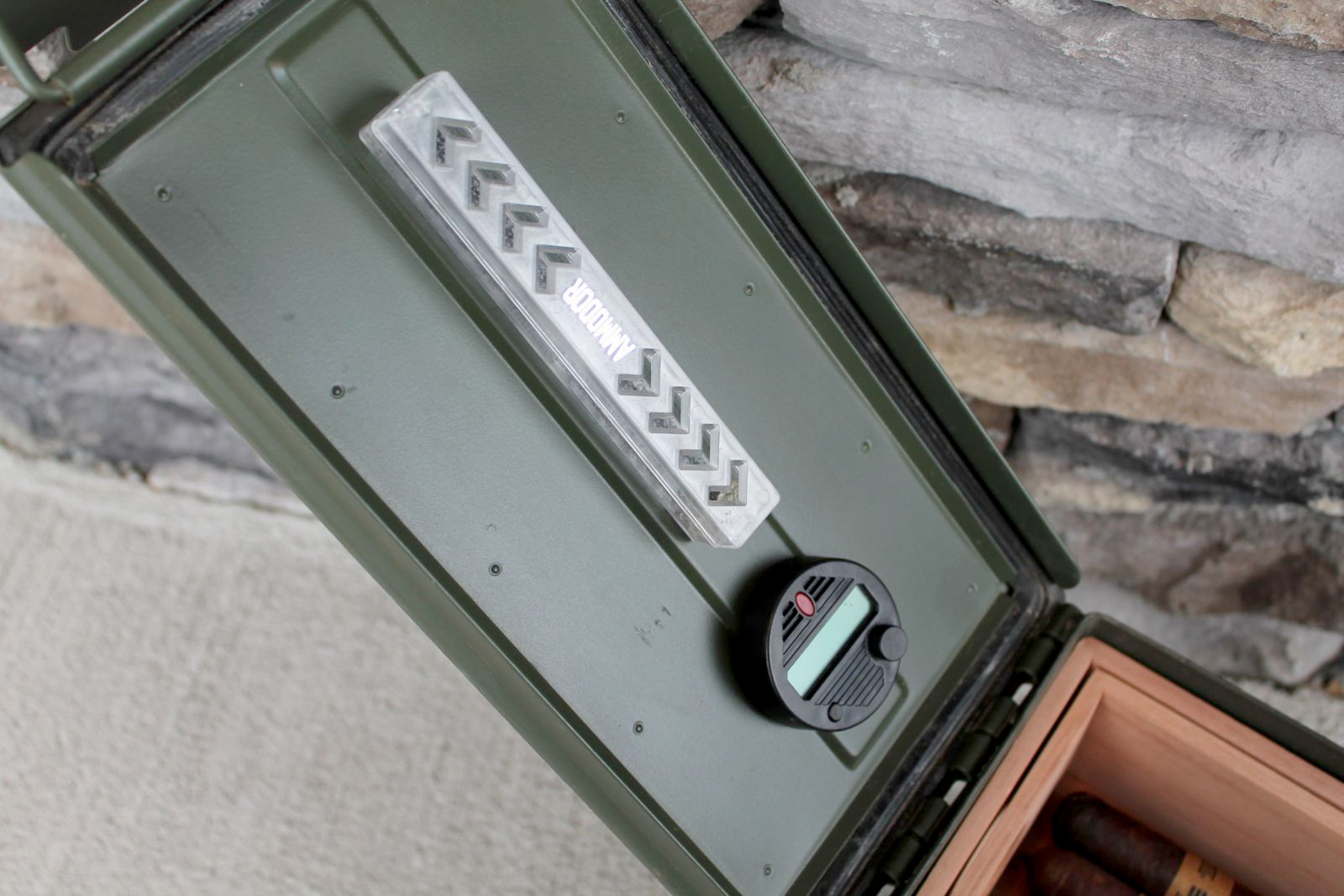 Ammo can humidor, two Boveda 69% humidity pack humidifiers, two Boveda 84% seasoning packs, Xikar Digital Hygrometer, Boveda Double Pack Holder and Ammodor Decal.
